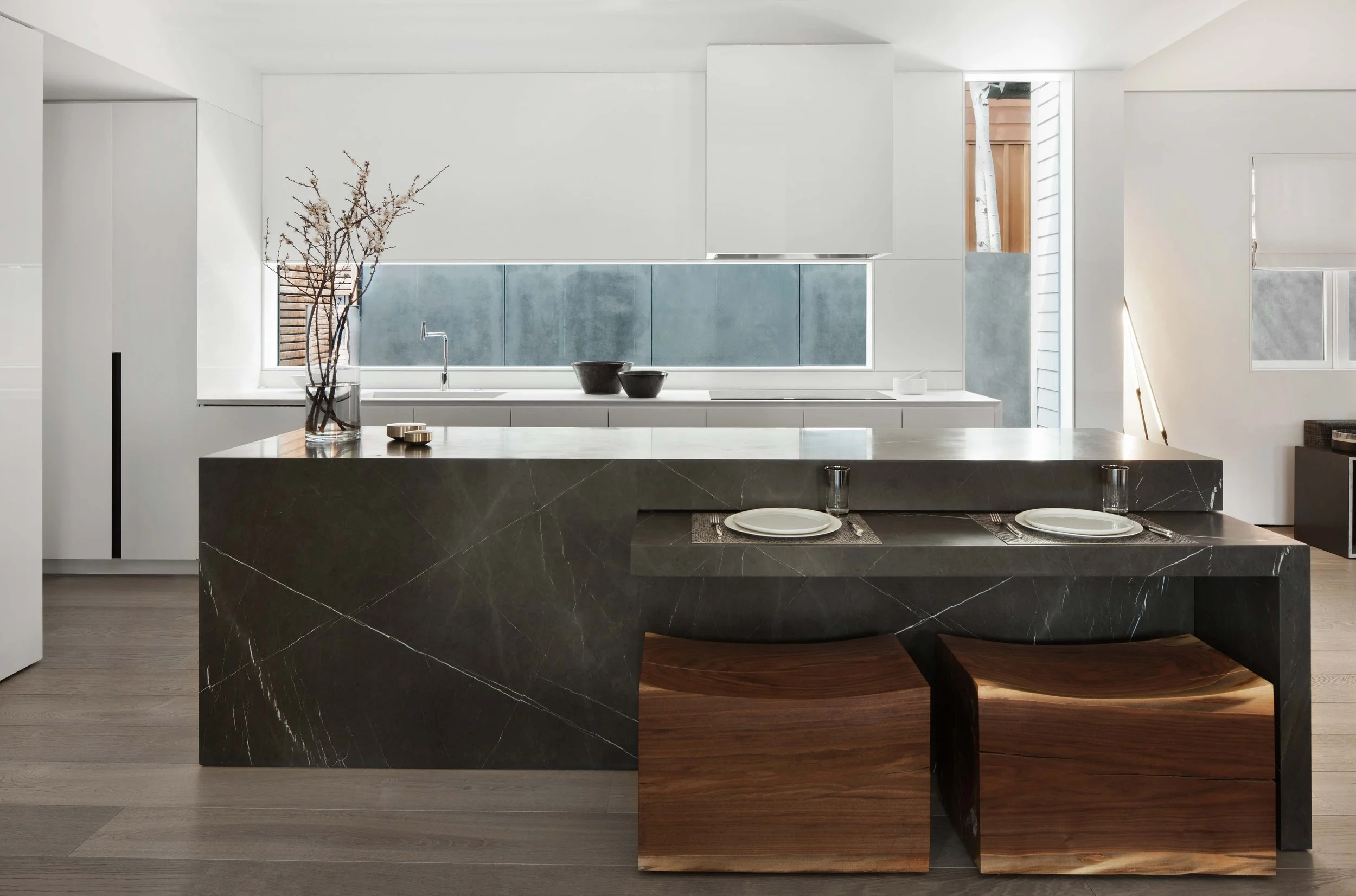 When we embarked on the collaborative effort with Poss Architecture and Workshop/APD to renovate and expand this property, we knew it wouldn’t be without its challenges. The cross-gable structure of the home created tight tolerances for our design, but the retention of its original character was paramount to our vision. Through intense collaboration with the designers, we transformed this West End 1880s miner’s cabin into a striking ski hideaway. The interior is bright and clean, while dark steel and marble accents create a bold contrast for this contemporary residence. Notable features of the home include sculpted Corian walls, a pullout breakfast bar from the island, an acoustically isolated guitar room, and an infrared sauna. This renovation project became a personal favorite, as the bold integration of thoughtful design pushed us to innovate in new ways.